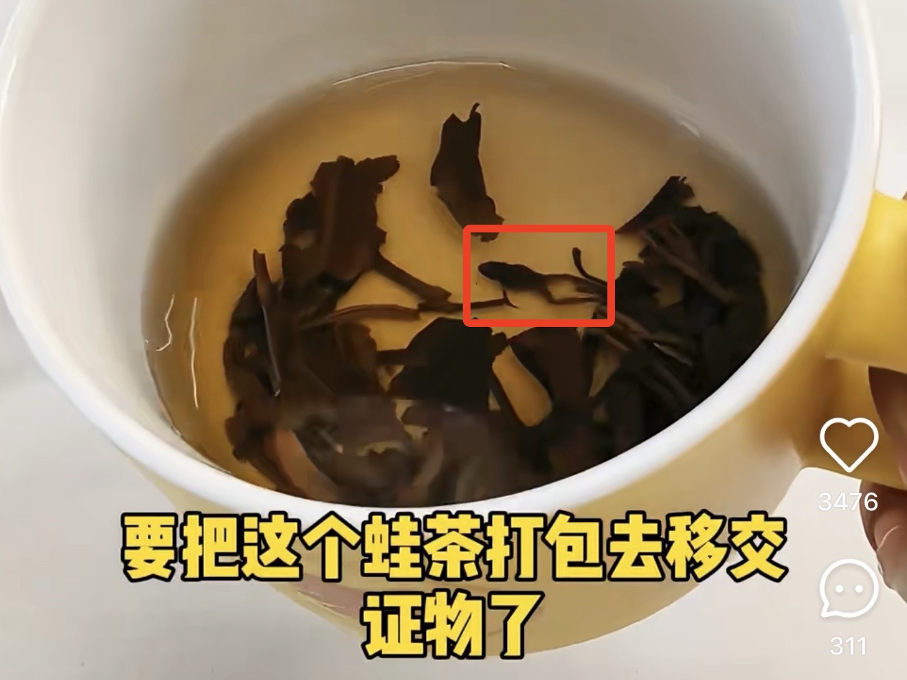 而從當事人發佈的視頻畫面可以看到,其所沖泡的茶水中確實存有疑似青蛙的物體,顏色、大小均與乾花相近。