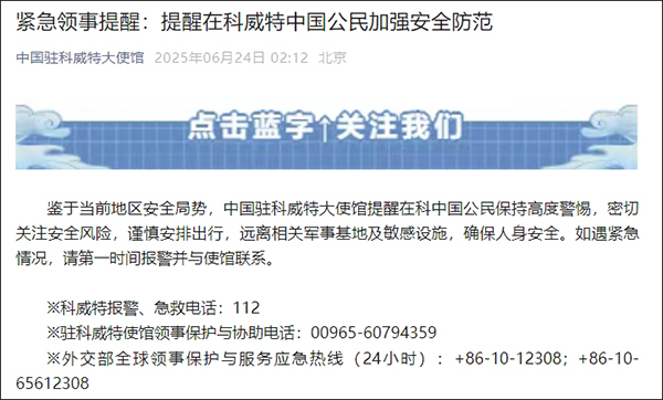 據微信公眾號“中國駐科威特大使館”6月24日消息,鑑於當前地區安全局勢,中國駐科威特大使館提醒在科中國公民保持高度警惕,密切關注安全風險,謹慎安排出行,遠離相關軍事基地及敏感設施,確保人身安全。如遇緊急情況,請第一時間報警並與使館聯繫。
