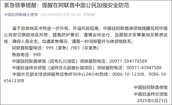 據微信公眾號“中國駐阿聯酋大使館”6月24日消息,鑑於目前地區衝突進一步升級,外溢風險較高,中國駐阿聯酋使領館提醒在阿中國公民密切跟蹤地區形勢,提高防護意識,謹慎安排出行,遠離相關軍事基地及敏感設施,確保人身安全。如遇緊急情況,請第一時間報警並與使領館聯繫。