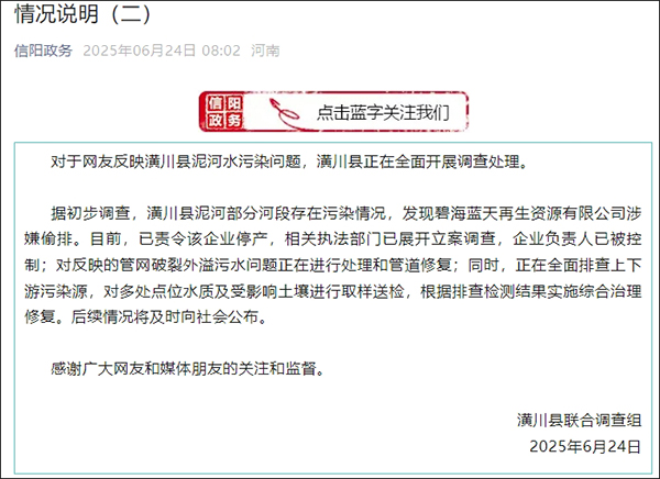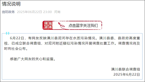 6月22日,潢川縣聯合調查組就曾就此事發布情況説明稱,潢川縣委、縣政府高度重視,已成立聯合調查組,對泥河附近疑似污染情況開展調查處置工作。調查情況將及時向社會公佈。