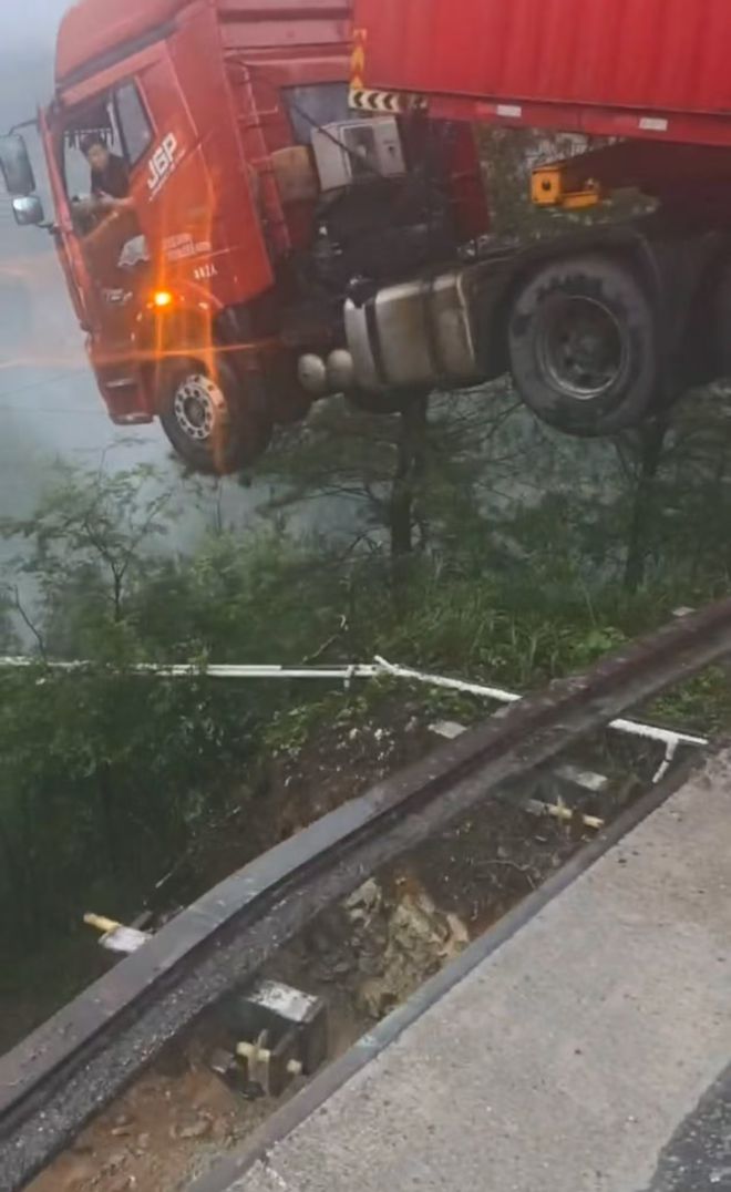 有視頻顯示,一紅色貨車車頭已經騰空,車身還留在路面,貨車司機尚待在車頭。路上的人對司機喊“你命大啊危險啊!只能等消防來啊!沒信號!”並稱下方已經有兩輛小車掉落。司機勸該路人不要再往前,該路人隨即發現路面有開裂,迅速往後撤。