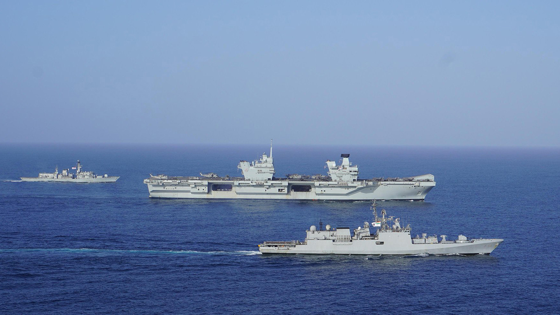 英國航母打擊羣在航渡期間與印度海軍“塔爾瓦”級(11356)F44“塔巴爾”號護衞艦進行聯合演習
