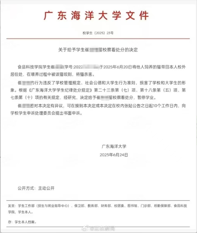 6月24日,廣東湛江。廣東海洋大學就“學生虐貓事件”發佈通報:食品科技學院學生崔某某於2025年6月20日將他人飼養的貓帶回本人校外居住處,在餵養過程中被該貓咬到,將貓殺害。