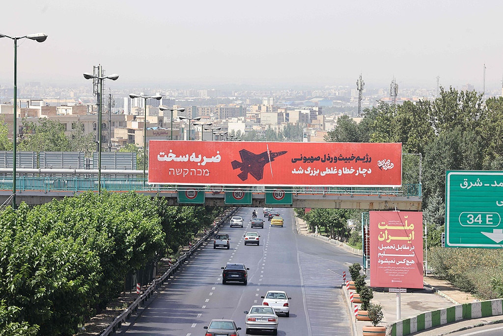 當地時間2025年6月24日,伊朗德黑蘭,一處廣告牌上用波斯語和希伯來語寫着:“一次沉重打擊……卑鄙邪惡的猶太復國主義政權(以色列)犯了一個嚴重錯誤。” 視覺中國