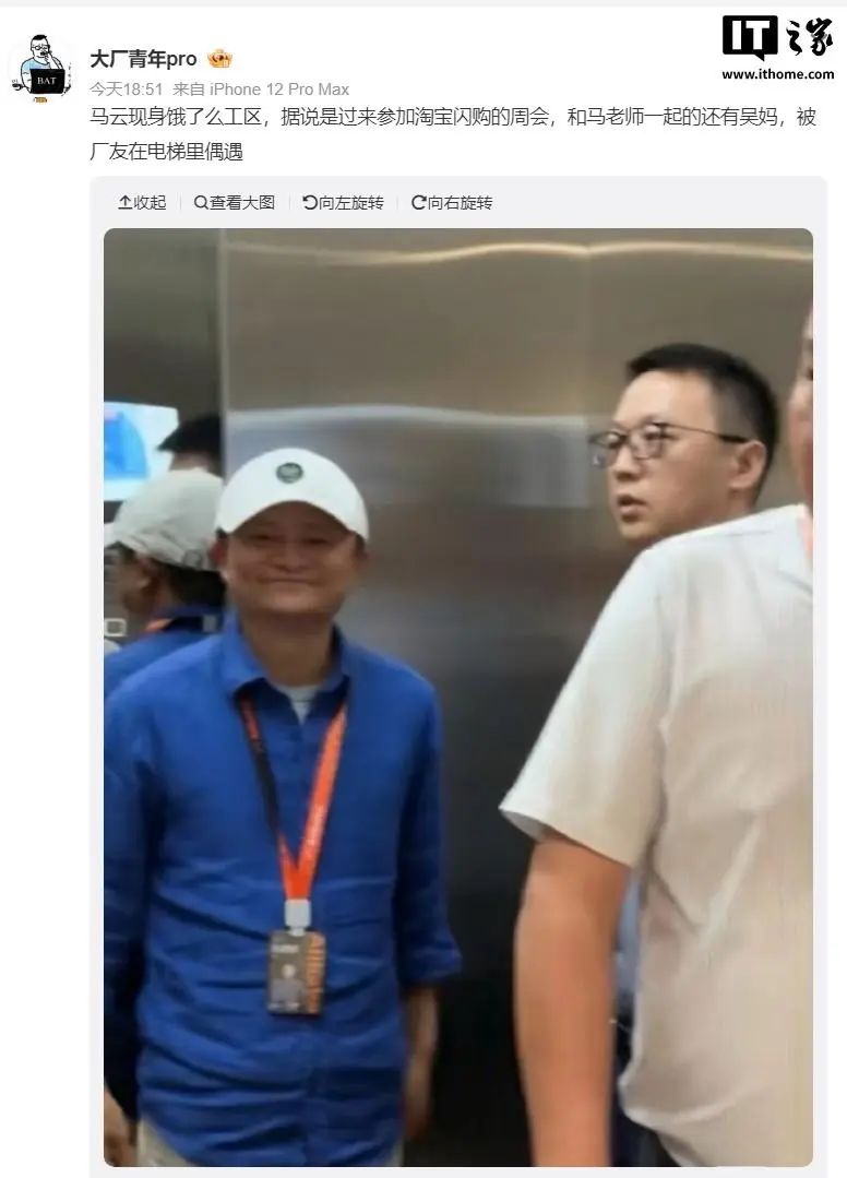 6月24日,多個大廠爆料賬號稱,馬雲今日現身餓了麼工區,據説是過來參加淘寶閃購的週會,和馬雲一起的還有阿里巴巴集團 CEO 吳泳銘。