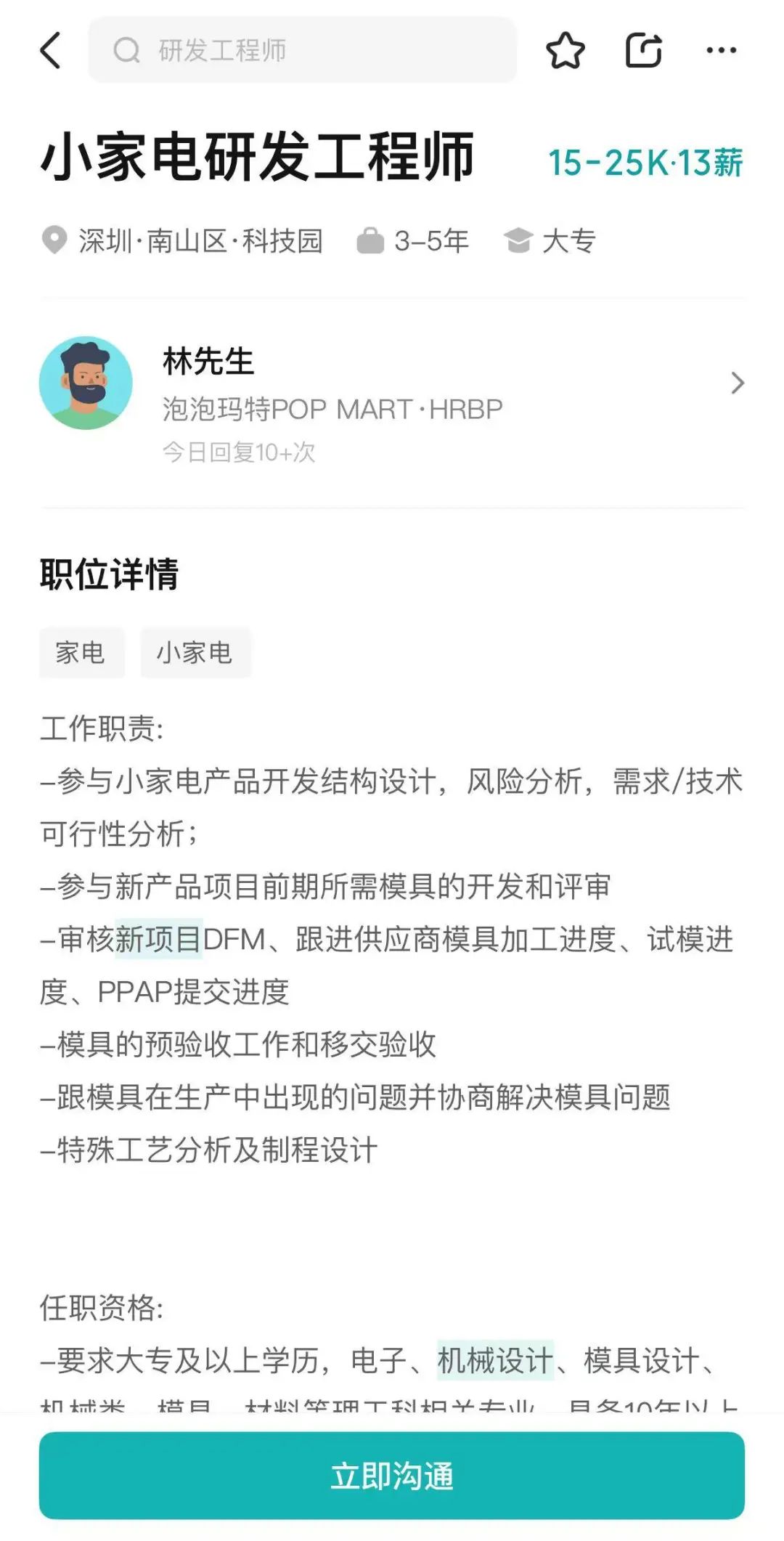 從多家招聘平台查詢獲悉,泡泡瑪特確實正在招聘家電領域相關人才,包括小家電採購主管、家電品質專家、研發工程師等崗位。泡泡瑪特招聘家電相關人才的薪資在12000-45000元之間,工作地點分佈在深圳、東莞、上海、北京等地。招聘要求上,部分崗位直接標明需要冰箱、咖啡機、早餐機、電水壺等相關經驗並表示該項目為A+及以上大投入項目。(界面新聞)