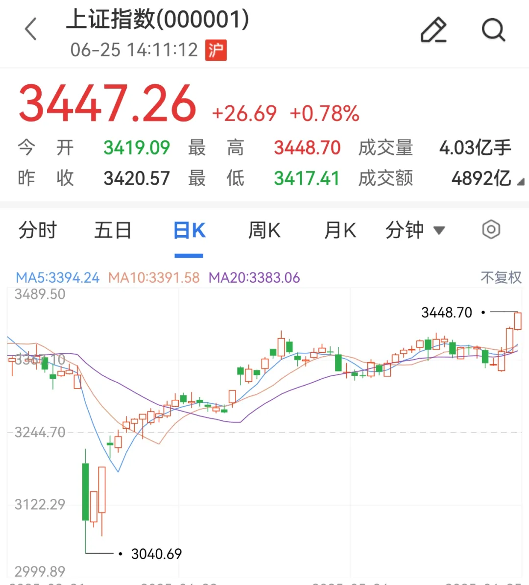 滬指創下年內新高 guancha 2025-06-25 午後指數持續走強,滬指漲0.7%,創下年內新高;創業板指拉昇漲近2%,深成指拉昇漲近1%。 大金融、軍工、半導體芯片、數字貨幣等方向漲幅居前,滬深京三市上漲個股近2900只。