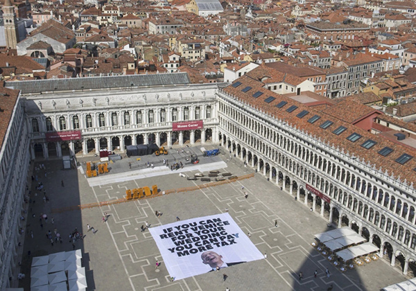 抗議人士在威尼斯聖馬可廣場拉起巨大橫幅反對貝索斯的婚禮。 美聯社
