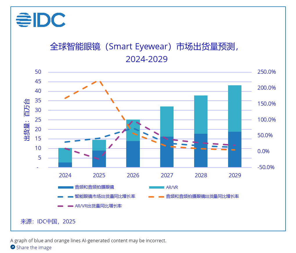 根據國際數據公司(IDC)最新發布的《全球智能眼鏡市場季度跟蹤報告》,2025年全球智能眼鏡(Smart Eyewear)市場出貨量預計達到1451.8萬台,同比增長42.5%,其中音頻和音頻拍攝眼鏡出貨量預計882.8萬台,同比增長225.6%;AR/VR設備出貨量預計569.0萬台,同比下降23.9%。