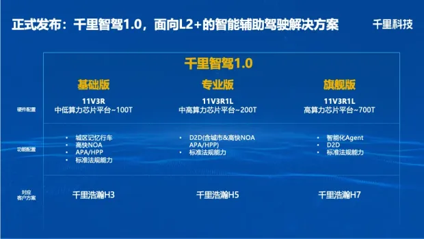具體來看,千里智駕1.0方案分為基礎版、專業版和旗艦版三大類別,分別對應千里浩瀚 H3、H5、H7三個方案。