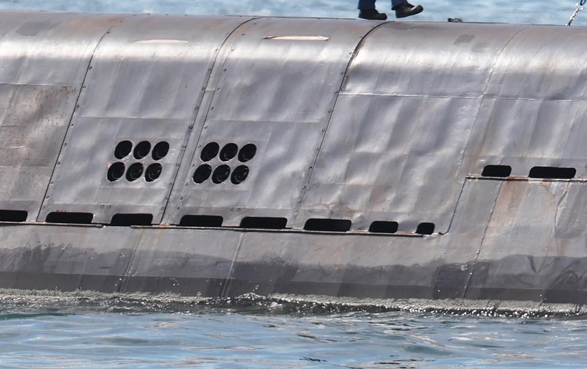 台媒記者還拍攝到了艇殼側面兩組六聯裝據稱是魚雷誘餌發射器的設施台灣“聯合新聞網”