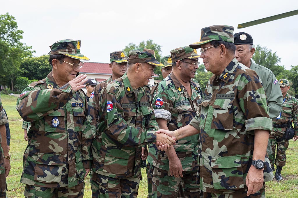 當地時間2025年6月26日,柬埔寨奧多棉吉省,洪森(右)在柬埔寨北部奧多棉吉省視察期間,與高級將領們打招呼 視覺中國