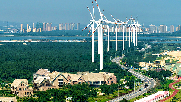 2025年6月25日,山東威海榮成市北部沿海,成排壯觀的風力發電機迎風舞動。 視覺中國