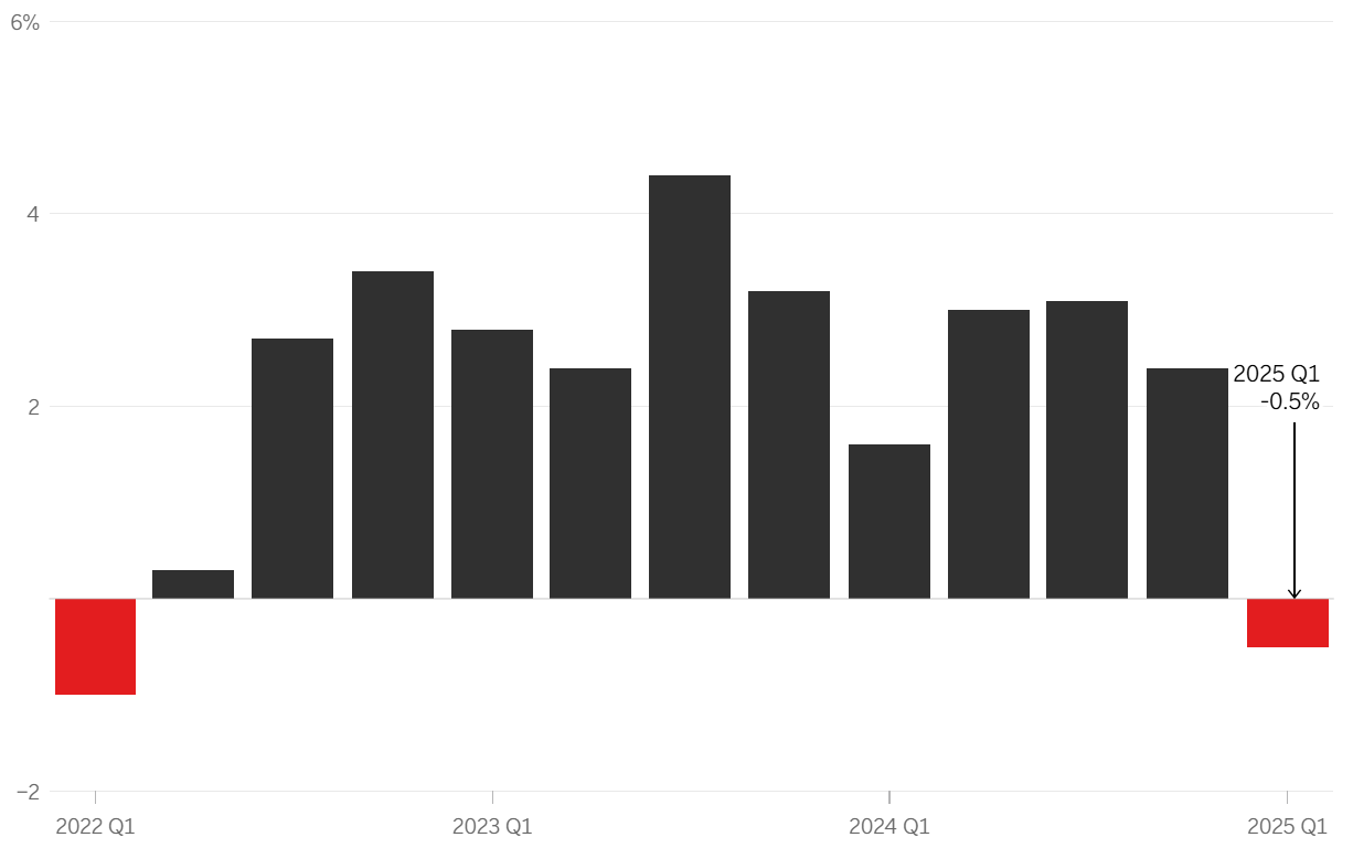 分析認為,造成經濟萎縮的重要原因,是美國企業和家庭趕在關税上漲前大幅增加進口,從而造成國內生產銷售減少。美商務部4月初次估值預計第一季度經濟將萎縮0.3%,5月將該數據修正為萎縮0.2%。經濟學家們曾預測,商務部的第三次也是最後一次估算值將不會有任何改變。