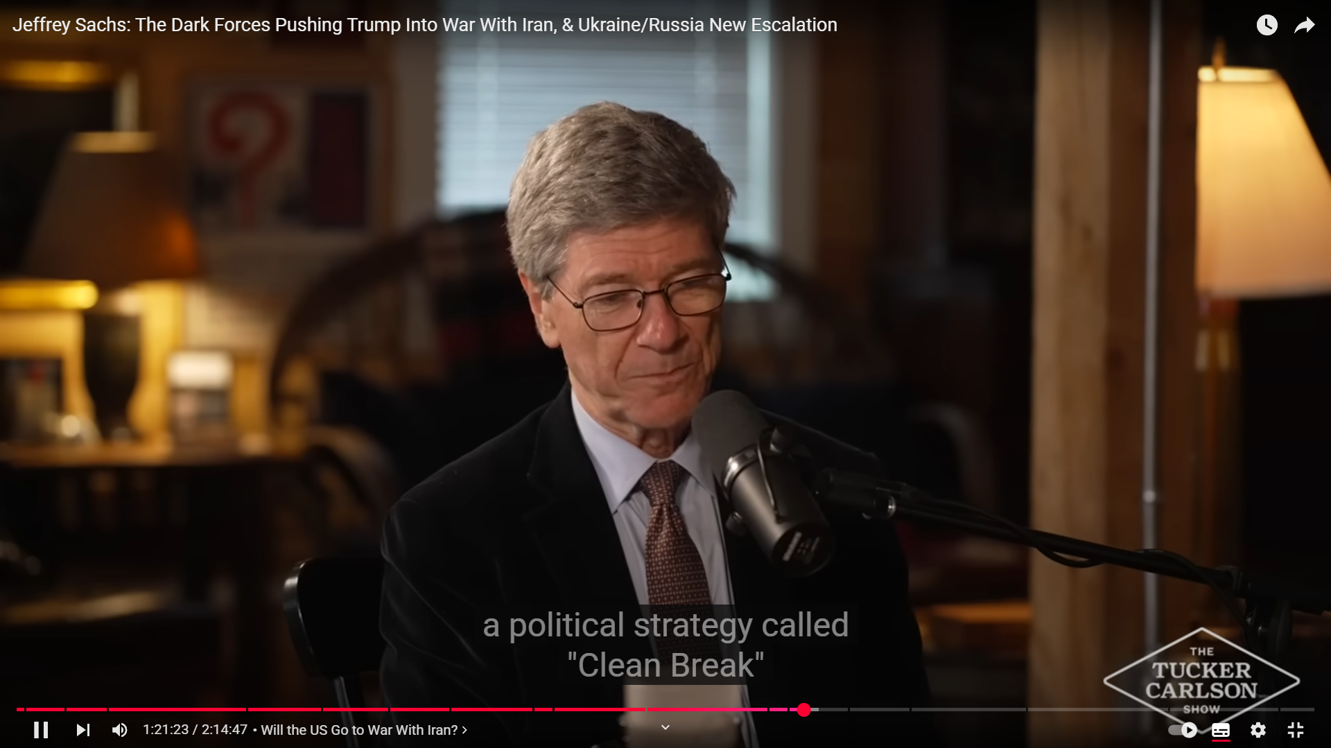 在2025年6月12日播出的傑弗裏·薩克斯與塔克·卡爾森對談的視頻節目中,薩克斯教授提及了內塔尼亞胡第一次擔任總理時出台的一份報告:《徹底決裂:保衞國家的新戰略》