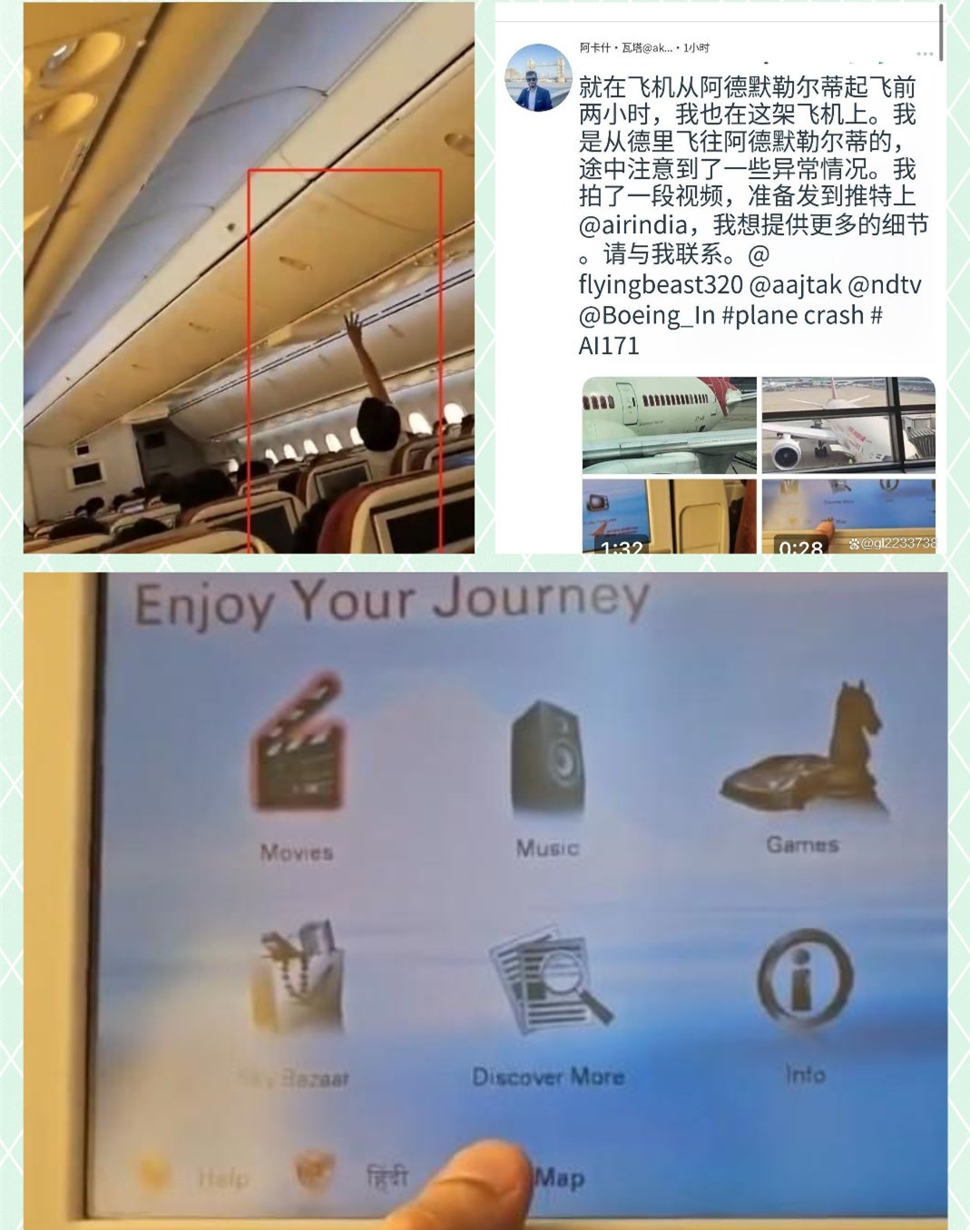 近期,社交媒體平台上出現了一則關於印度波音客機墜機前2小時的視頻——一位乘客從德里乘坐這架飛機抵達古吉拉特邦的艾哈邁達巴德,該乘客表示,他在飛機上發現空調和娛樂系統都停止工作,於是錄下視頻計劃向航空公司投訴。視頻畫面顯示,座位上有乘客試圖調整空調出風口;座椅靠背的娛樂設施屏幕黑屏且觸摸感到發燙,疑似電路出現問題。