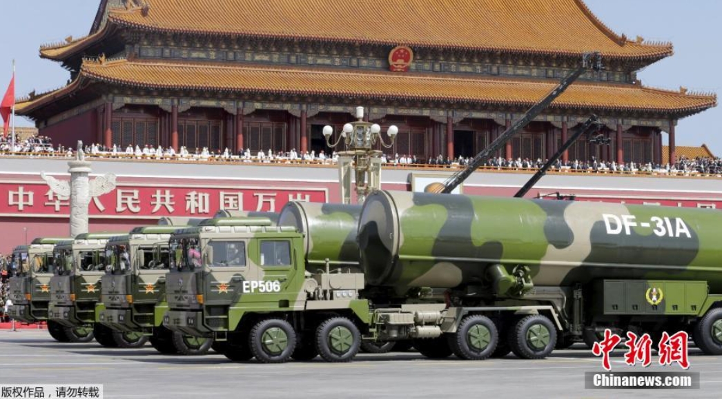 2015年9月3日,中國人民抗日戰爭暨世界反法西斯戰爭勝利70週年紀念大會在北京隆重舉行。圖為東風-31彈道導彈發射車接受檢閲。中新網