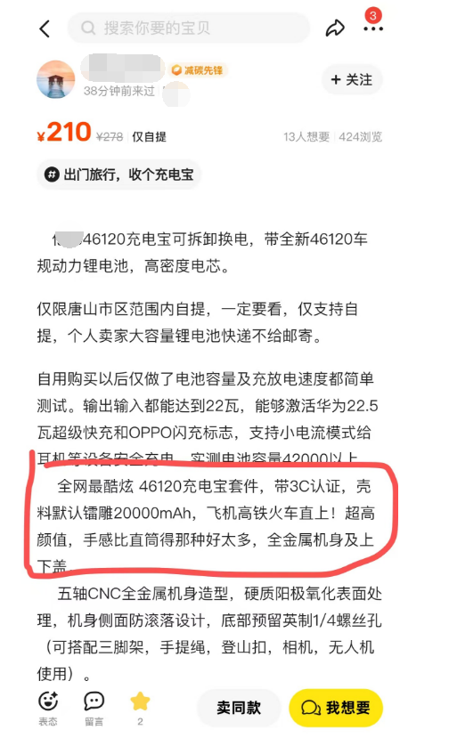 實際上在二手平台上就有不少用車用動力電池的電芯改裝而來的大容量充電寶,這些充電寶主打的賣點是使用車用級電芯,有着極為巨大的容量。這些屬於“三無”產品的改裝充電寶沒有經過任何安全性測試與驗證,本身就風險極高。而且其使用的電芯來源也非常可疑,甚至不排除報廢電動車動力電池上拆卸下來,畢竟那些電池規格看着可眼熟了。