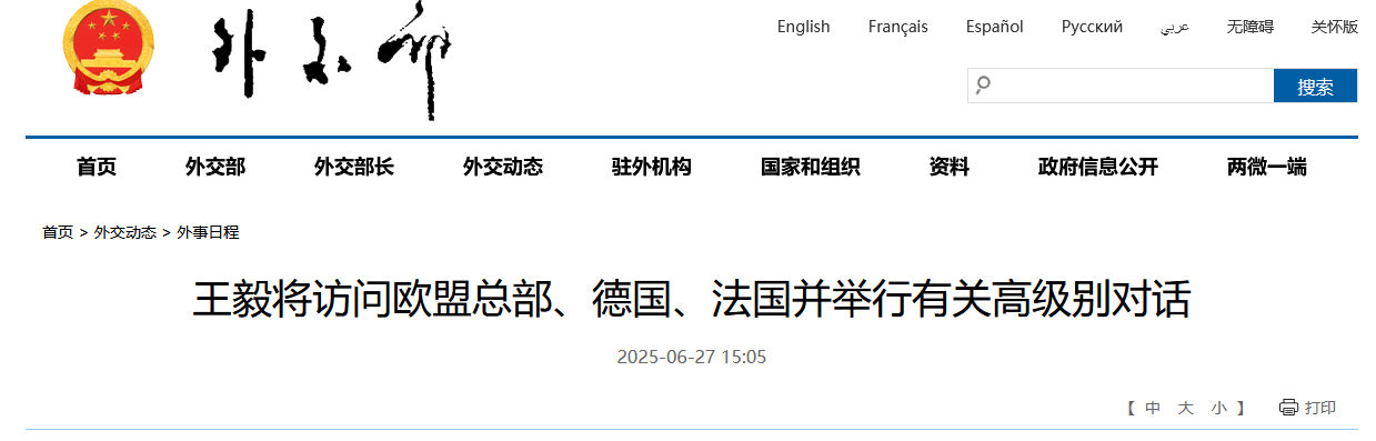 應歐盟外交與安全政策高級代表卡拉斯、德國外長瓦德富爾、法國外長巴羅邀請,中共中央政治局委員、外交部長王毅將於6月30日至7月6日訪問歐盟總部並舉行第十三輪中歐高級別戰略對話,訪問德國並舉行第八輪中德外交與安全戰略對話,訪問法國舉行中法外長會談並出席中法高級別人文交流機制新一次會議。在布魯塞爾期間,王毅還將同比利時首相德韋弗、副首相兼外交大臣普雷沃分別會見、會談。