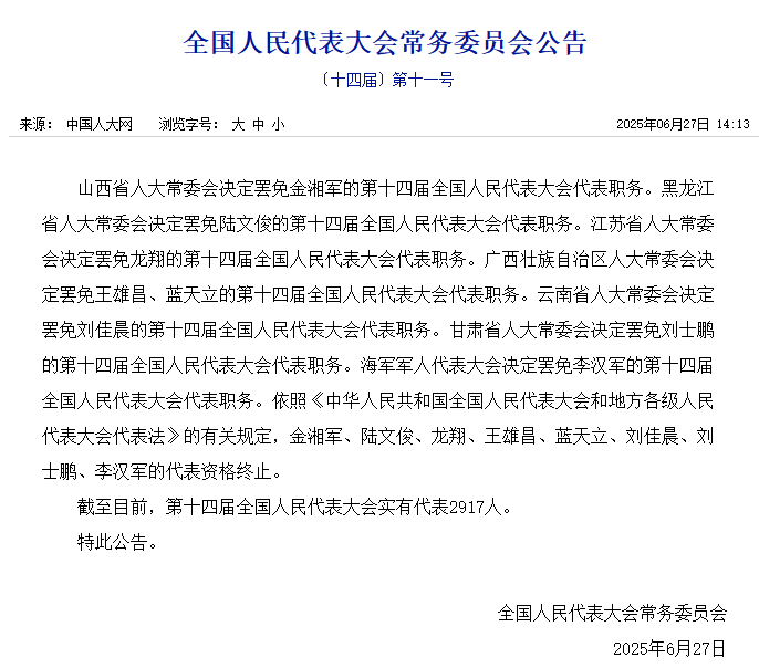 山西省人大常委會決定罷免金湘軍的第十四屆全國人民代表大會代表職務。黑龍江省人大常委會決定罷免陸文俊的第十四屆全國人民代表大會代表職務。江蘇省人大常委會決定罷免龍翔的第十四屆全國人民代表大會代表職務。廣西壯族自治區人大常委會決定罷免王雄昌、藍天立的第十四屆全國人民代表大會代表職務。雲南省人大常委會決定罷免劉佳晨的第十四屆全國人民代表大會代表職務。甘肅省人大常委會決定罷免劉士鵬的第十四屆全國人民代表大會代表職務。海軍軍人代表大會決定罷免李漢軍的第十四屆全國人民代表大會代表職務。依照《中華人民共和國全國人民代表大會和地方各級人民代表大會代表法》的有關規定,金湘軍、陸文俊、龍翔、王雄昌、藍天立、劉佳晨、劉士鵬、李漢軍的代表資格終止。