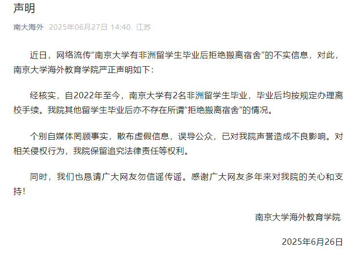 近日,網絡流傳“南京大學有非洲留學生畢業後拒絕搬離宿舍”的不實信息,對此,南京大學海外教育學院嚴正聲明如下: