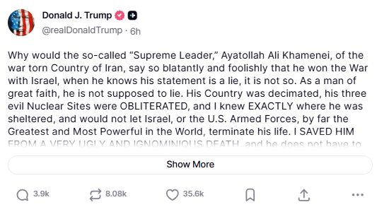 特朗普寫道:“為何哈梅內伊會如此‘直白且愚蠢’地宣稱自己在與以色列的戰爭中取得了勝利?要知道,他知道自己這麼説就是謊言,事實並非如此。作為一個有着堅定信仰的人,他本不該説謊。”