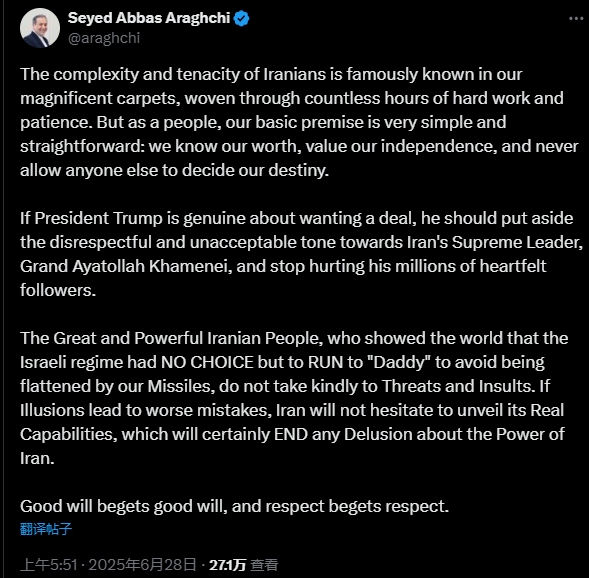 阿拉格奇在社交媒體X平台發文稱,伊朗是一個獨立堅韌的民族,“絕不允許任何人決定我們的命運”。他喊話特朗普:“如果特朗普總統真心希望達成協議,他就應該停止對哈梅內伊的不尊重和不可接受的語氣,不要再傷害他數百萬忠實的追隨者。”