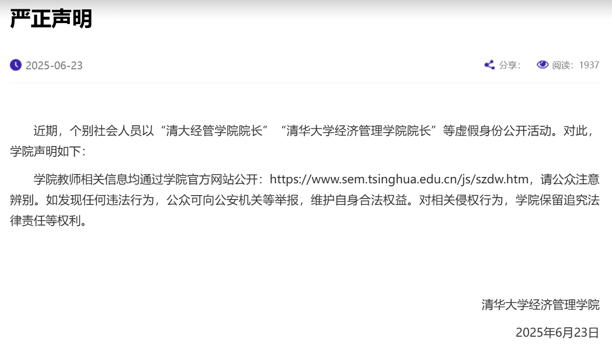 據清華大學經濟管理學院網站消息,6月23日,清華大學經管學院曾發佈嚴正聲明稱,近期,個別社會人員以“清大經管學院院長”“清華大學經濟管理學院院長”等虛假身份公開活動。對此,學院聲明如下: