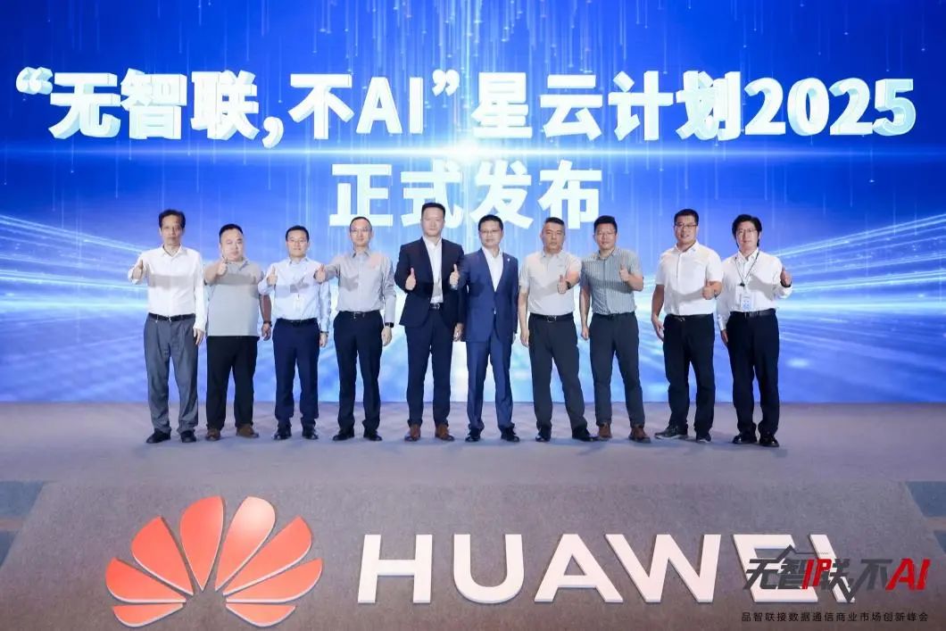隨後,華為企業業務MKT副總裁鬱賽華、華為數據通信產品線首席營銷官殷玉樓、華為深圳政企業務副總經理劉貴、華為深圳政企數通解決方案銷售部部長羅濤、華為深圳政企夥伴與商業銷售部總經理王克、深圳市今天國際物流技術股份有限公司企業管理中心總經理嚴雨華、深圳市聚迅科技有限公司董事長陶超、索爾集團股份有限公司董事長彭偉高及深圳市星華時代科技有限公司董事長米慶華等嘉賓共同登台,與華為中國政企商業MKT與解決方案銷售部部長浦強一起發佈了《“無智聯,不AI”星雲計劃2025》。
