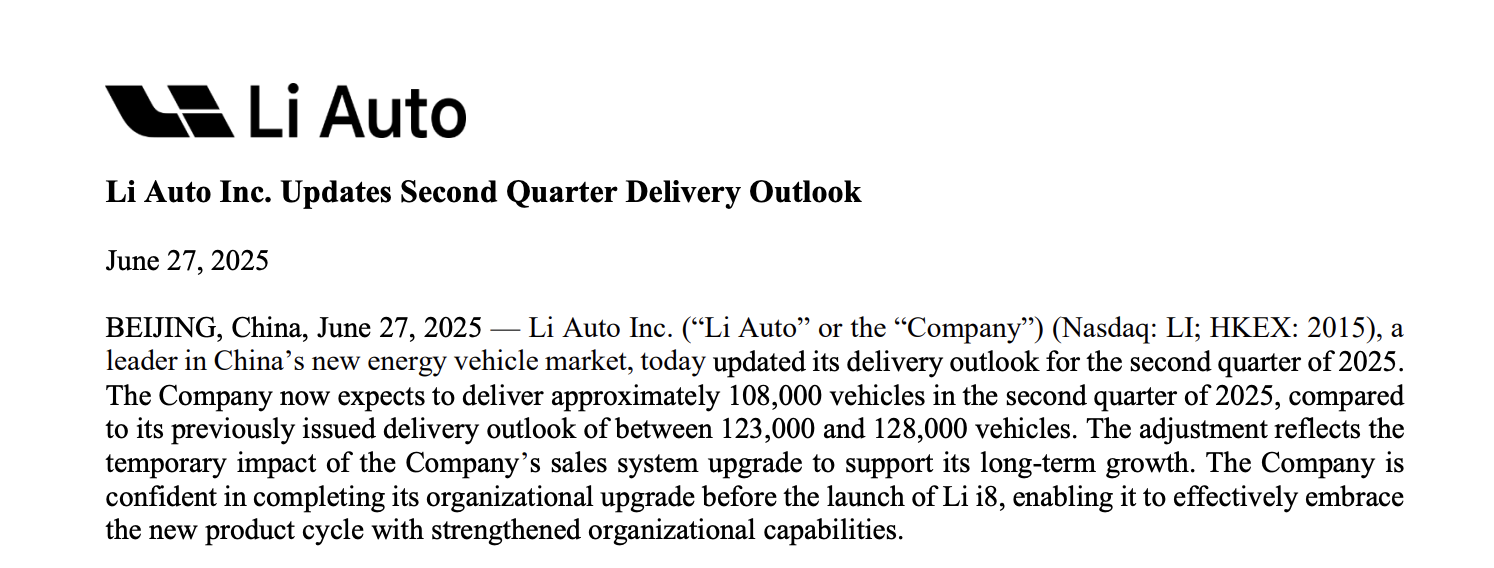 (文/觀察者網周盛明 編輯/高莘)2025年6月27日,理想汽車投資者關係官方網站發佈公告,理想汽車更新了其2025年第二季度的交付預期。