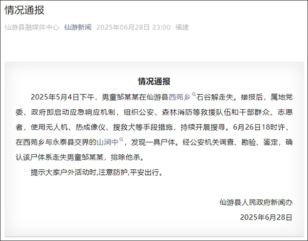 據福建省莆田市仙遊縣融媒中心微信公眾號“仙遊新聞”消息,仙遊縣人民政府新聞辦6月28日發佈情況通報稱,5月4日下午,男童鄒某某在仙遊縣西苑鄉石谷解走失。接報後,屬地黨委、政府即啓動應急響應機制,組織公安、森林消防等救援隊伍和幹部羣眾、志願者,使用無人機、熱成像儀、搜救犬等手段措施,持續開展搜尋。6月26日18時許,在西苑鄉與永泰縣交界的山澗中,發現一具屍體。經公安機關調查、勘驗、鑑定,確認該屍體系走失男童鄒某某,排除他殺。