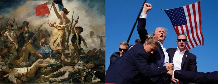 6年後,同樣是在7月,一次未遂刺殺給身纏官司、負重參選的特朗普帶來了一生中最耀眼的高光時刻:那幅面沾鮮血、揮舞拳頭、背靠國旗的照片,如同收藏在巴黎盧浮宮的那副《自由引導人民》名畫,讓老特與高舉三色旗的自由女神瑪麗安娜比肩齊眉,以“高大上”的形象定格在人們的視野和記憶中,成了歷史的經典。