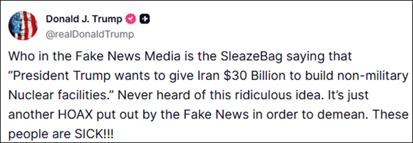 特朗普當地時間6月27日在社交平台發文稱,“在報道假新聞的媒體中,誰是那個説‘特朗普總統希望給伊朗300億美元建設非軍事核設施’的‘可鄙之人’?從來沒聽説過這個荒謬想法。這只是假新聞為了貶低而炮製的又一場騙局。這些人有病!”