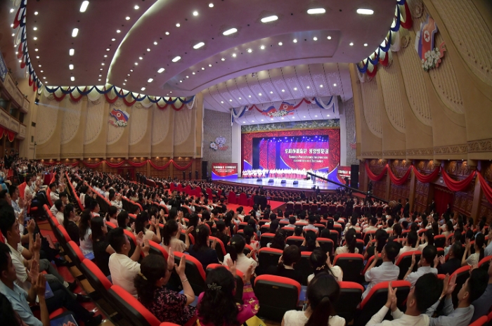 當天,金正恩與柳比莫娃一起觀看了俄羅斯和朝鮮文藝工作者帶來的公演。
