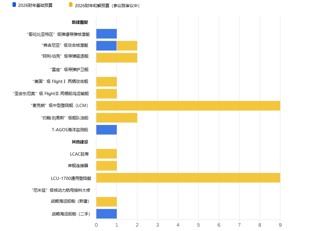 在2026財年採購19艘新艦船,3艘來自基礎預算(1艘“哥倫比亞”級核潛艇、1艘“弗吉尼亞”級核潛艇和1艘T-AGOS海洋監視船)、16艘來自和解預算(2艘“阿利·伯克”級驅逐艦、1艘“弗吉尼亞”級核潛艇、1艘兩棲船塢登陸艦、1艘兩棲攻擊艦、9艘中型登陸艦和2艘艦隊油船),以及採購43架固定翼飛機、直升機和無人駕駛飛機(23架F-35B/C戰機、12架CH-53K“種馬王”重型直升機、4架E-2D艦載預警機、3架MQ25艦載無人機和1架UC-12通用飛機);