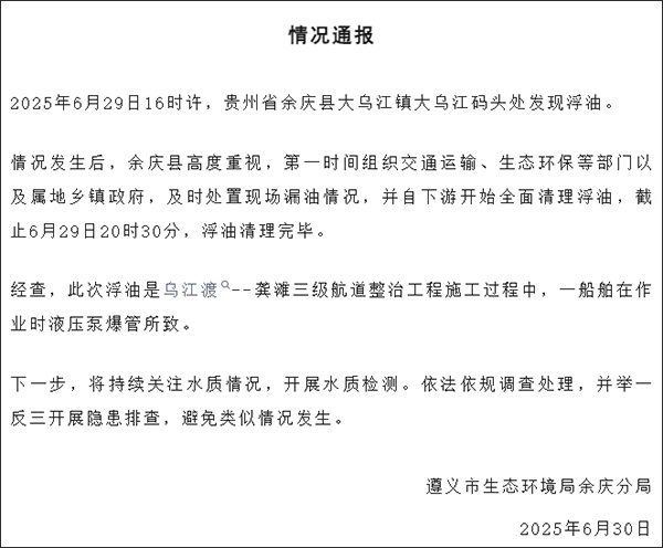 據貴州省遵義市餘慶縣融媒體中心微信公眾號“今日餘慶”消息,遵義市生態環境局餘慶分局6月30日發佈情況通報稱,6月29日16時許,貴州省餘慶縣大烏江鎮大烏江碼頭處發現浮油。
