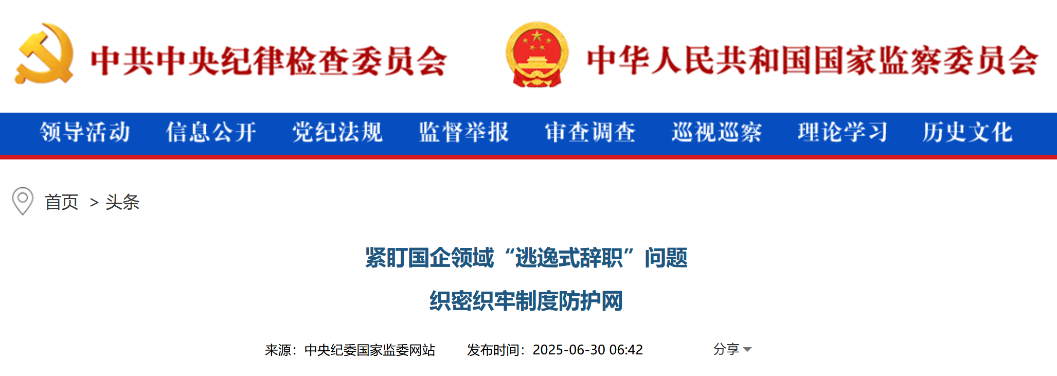 30日,中央紀委國家監委網站發文《緊盯國企領域“逃逸式辭職”問題 織密織牢制度防護網》,全文如下: