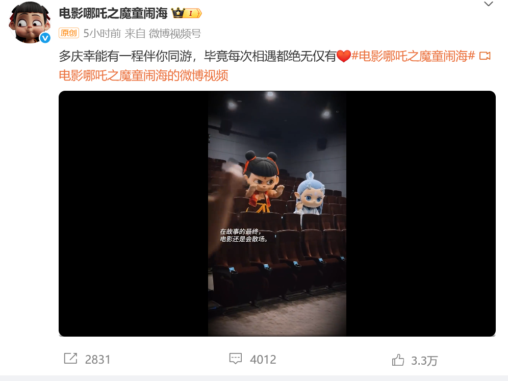 《哪吒2》官方微博也發佈視頻告別:“多慶幸能有一程伴你同遊,畢竟每次相遇都絕無僅有。”視頻中,電影的兩大主要角色——哪吒與敖丙坐在影院,與大家揮手告別:“再見了,這段像夢一樣的日子。在故事的最終,電影還是會散場。這場絕無僅有的相遇,回憶如暖流,幸與你同遊。去感受難得的人生吧!去創造全新的故事吧!要再見啦,會再見的!”