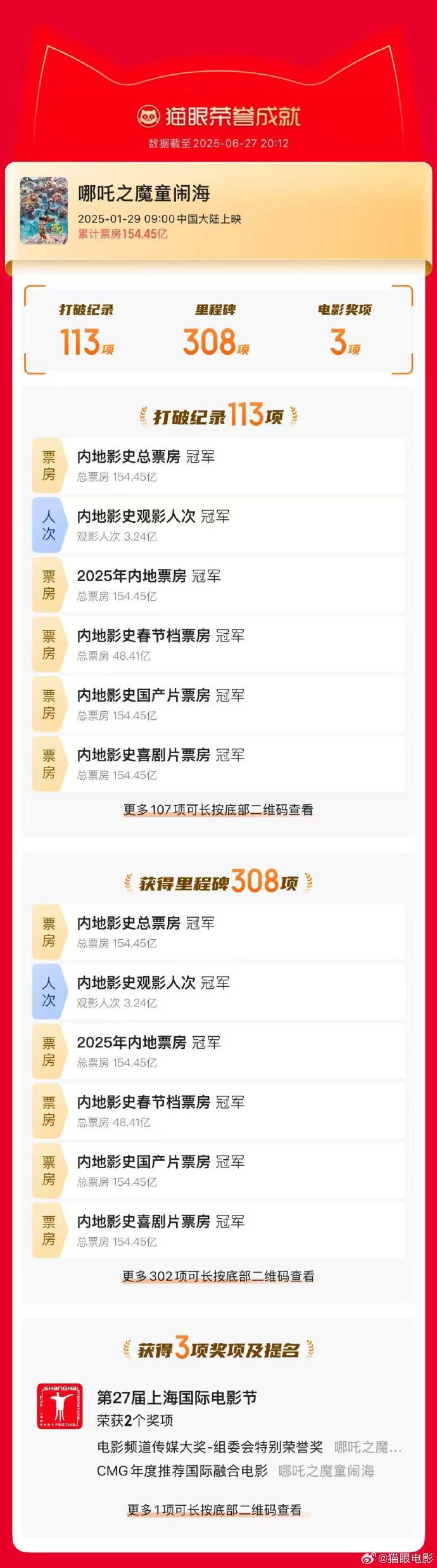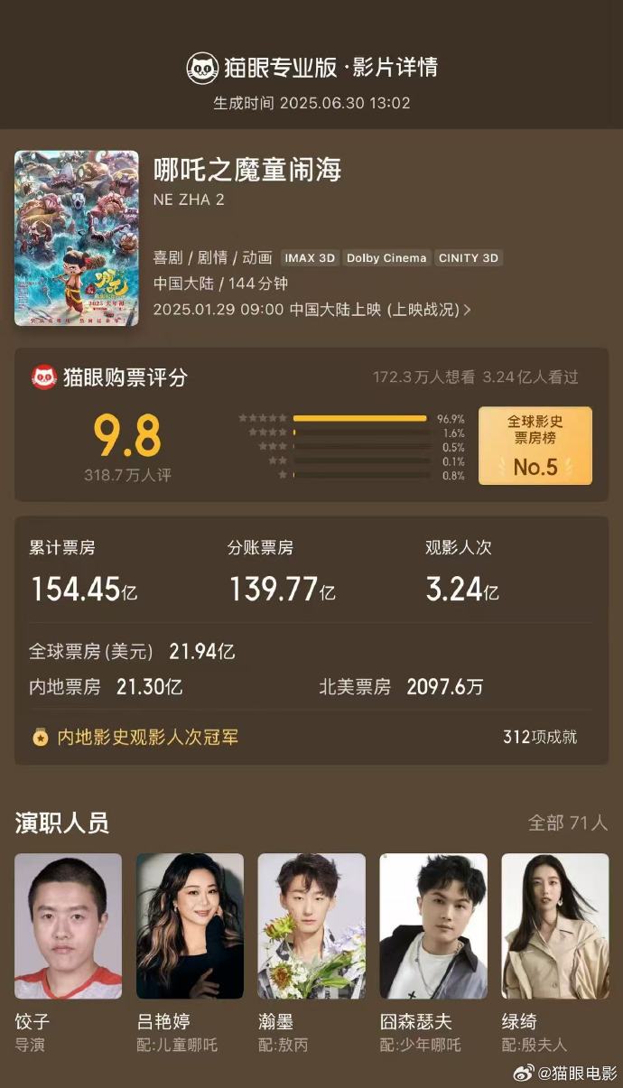 據貓眼專業版數據,截至6月30日,《哪吒2》累計總票房154.4億,總觀影人次3.24億,上映至今共打破113項紀錄,獲得308項里程碑成就。《哪吒2》的主要成就包括:中國影史票房榜冠軍、中國影史觀影人次冠軍、全球影史票房榜第5位、全球影史動畫片票房榜冠軍等。