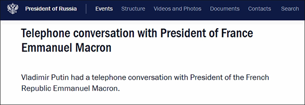 馬克龍辦公室表示,通話持續了兩個小時,馬克龍呼籲在烏克蘭停火,並開始就結束衝突進行談判。