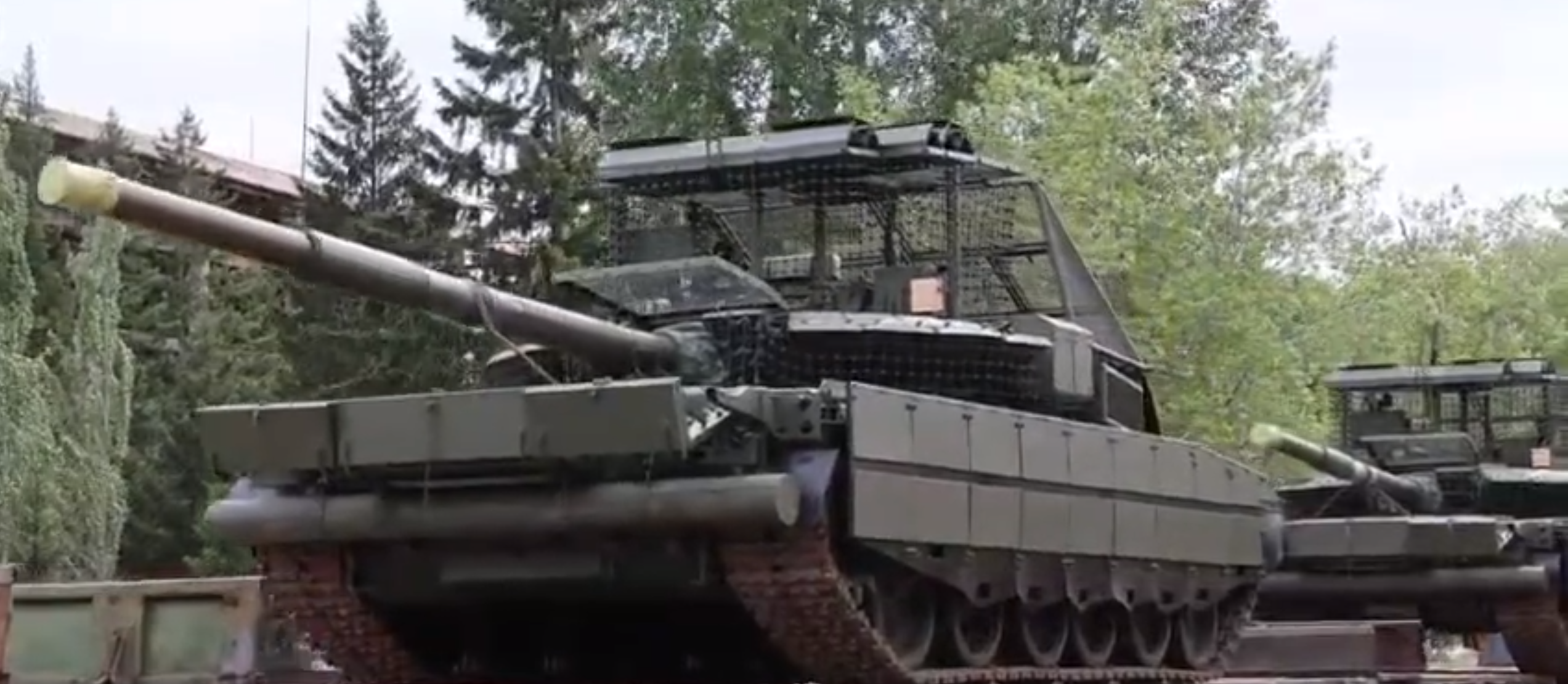 烏軍在戰地改裝的,增加了大量爆炸反應裝甲和頂部格柵防護措施的艾布拉姆斯(上圖)俄軍制式化的T-80BVM頂部防護措施