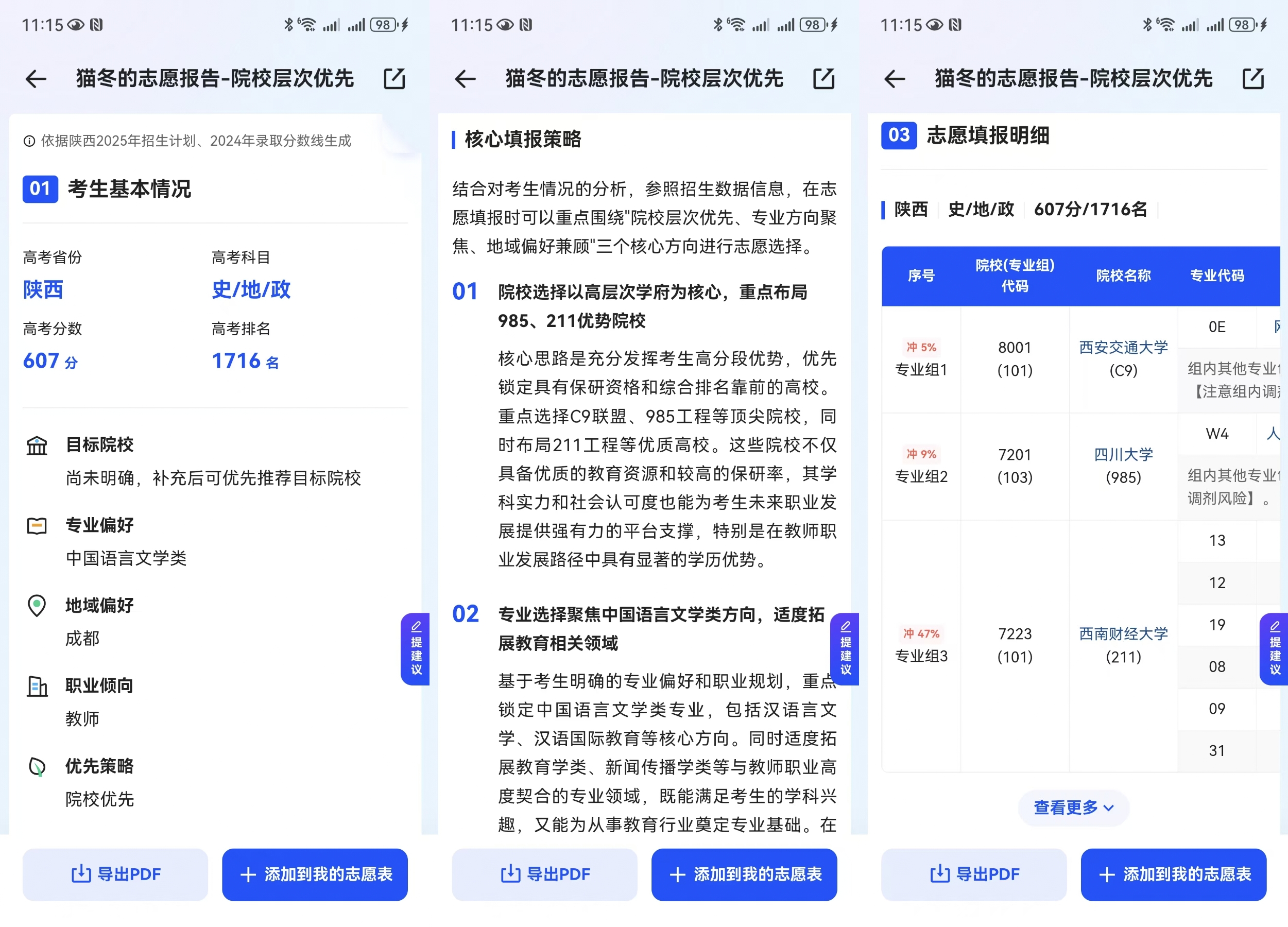 通過執行、檢查、反思過程,系統會把它轉化到操作志願表的指令,最終我們會根據每個維度的打分,根據用户訴求,生成一個最終的志願表。因為執行過程中我們可以每個志願打分六個維度結構,綜合用户對每個維度的訴求,給他綜合排序。最終,系統會把整個過程規劃、反思過程寫成一份整體志願報告,形成完整的整理過程。