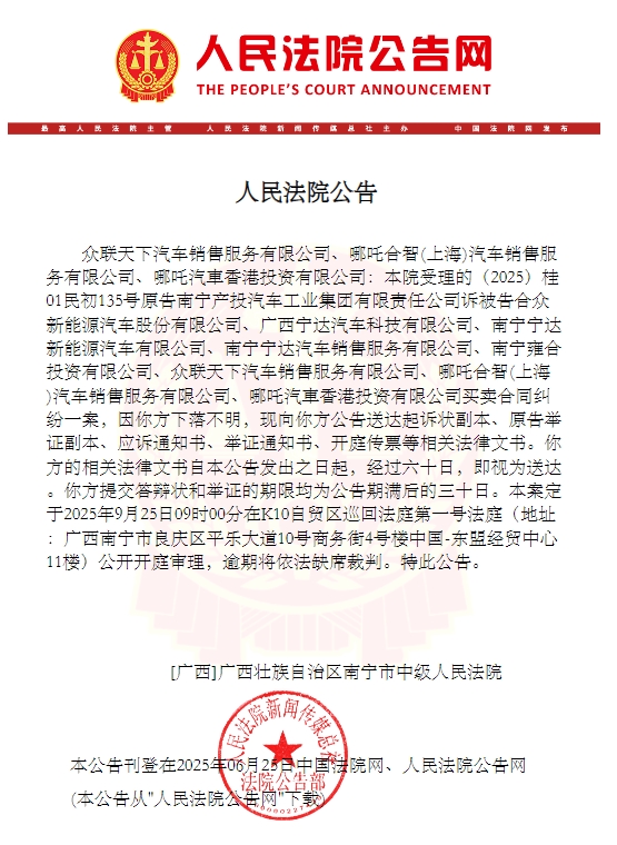 南寧市中院公告稱,該院受理的(2025)桂01民初135號原告南寧產投汽車工業集團有限責任公司訴被告合眾新能源汽車股份有限公司、廣西寧達汽車科技有限公司、南寧寧達新能源汽車有限公司、南寧寧達汽車銷售服務有限公司、南寧雍合投資有限公司、眾聯天下汽車銷售服務有限公司、哪吒合智(上海)汽車銷售服務有限公司、哪吒汽車香港投資有限公司買賣合同糾紛一案,因以上哪吒汽車關聯公司下落不明,因此公告送達相關法律文書。相關法律文書自公告發出之日起,經過六十日,即視為送達。哪吒汽車方面提交答辯狀和舉證的期限均為公告期滿後的三十日。