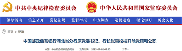 中國郵政儲蓄銀行湖北省分行原行長張雪松被“雙開”:隱瞞不報家庭房產