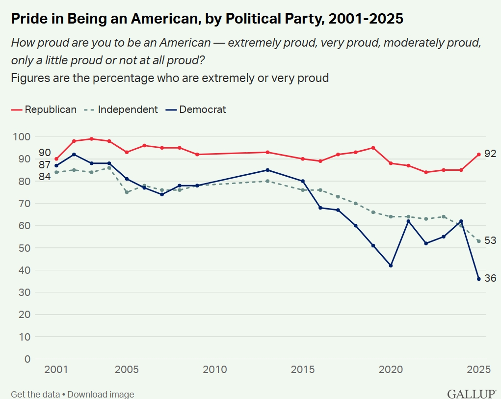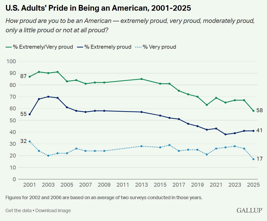 蓋洛普表示:“21世紀初,美國成年人幾乎一致表示,他們對自己身為美國人感到極其自豪或非常自豪。但過去25年來,由於政治和世代更替等因素,這種國家的團結感已被侵蝕。”
