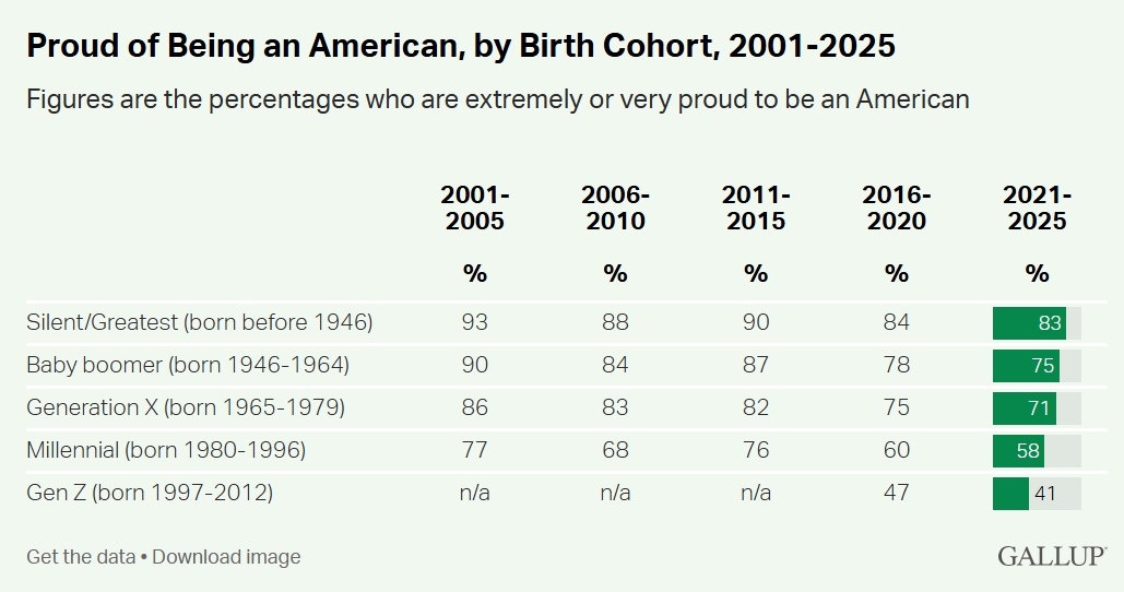 蓋洛普分析稱:“儘管從‘千禧一代’(出生於1980至1996年間)到‘沉默的一代’(出生於1946年前)中的大多數人都表達了他們的自豪感,但自2001年至2005年以來,在所有世代中,‘極其’或‘非常’自豪的比例都下降了10%或更多。這種變化大部分發生在2016年之後。”