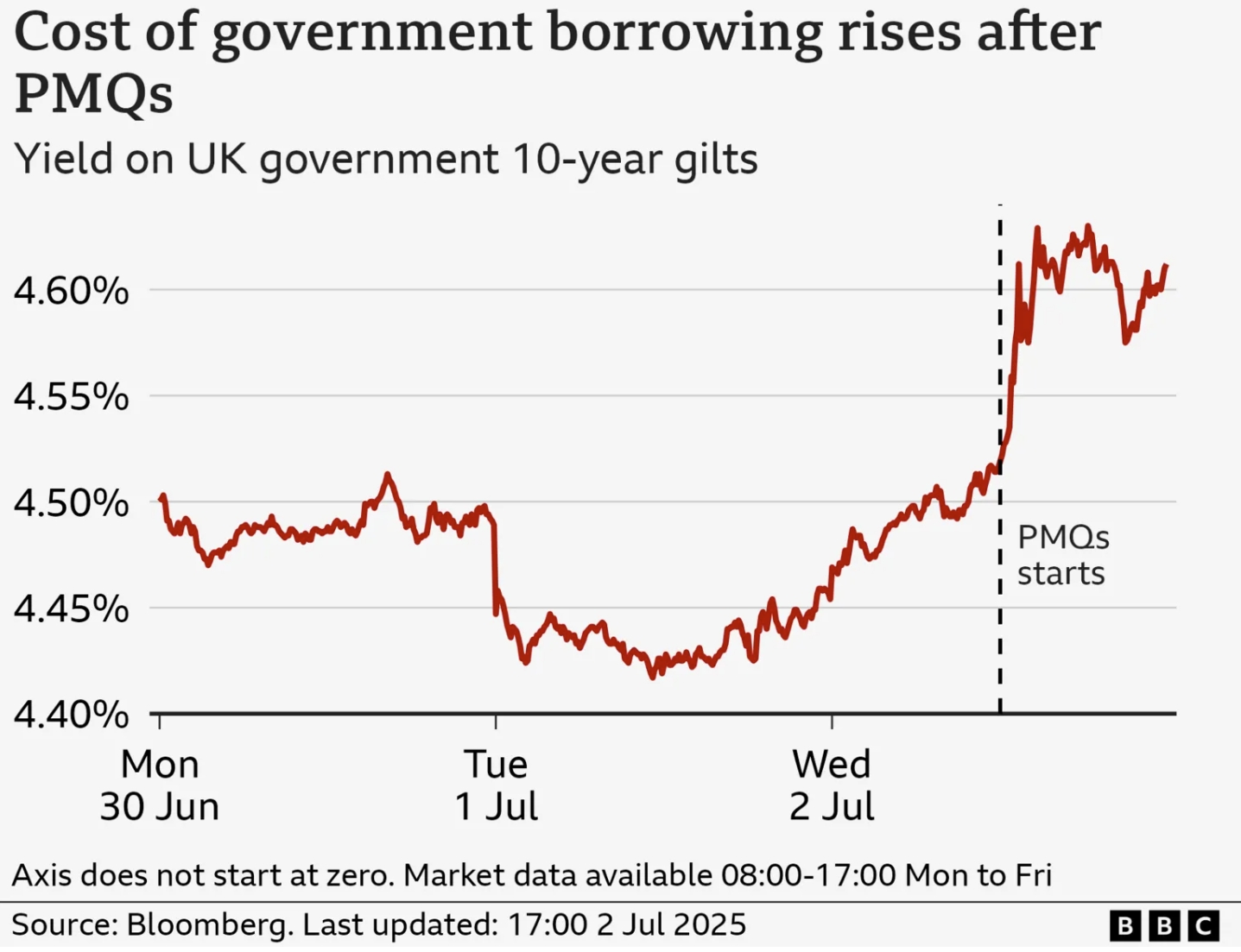 首相質詢後,英國10年期國債收益率上升。BBC製圖