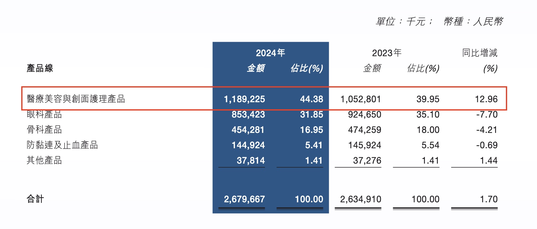 華潤醫藥覆蓋全國28個省級區域的OTC渠道網絡,恰恰成為破解這一難題的關鍵。其深度滲透的醫療機構、藥店及終端市場網絡,將大幅提升昊海生科產品的市場覆蓋率,特別是加速在二三線城市的市場下沉。值得注意的是,昊海生科2024年業務構成中,醫療美容與創面護理產品營收達11.95億元,佔總營收的44.38%,其中玻尿酸產品貢獻7.42億元,佔醫美板塊的62.05%,同比增長23.23%。
