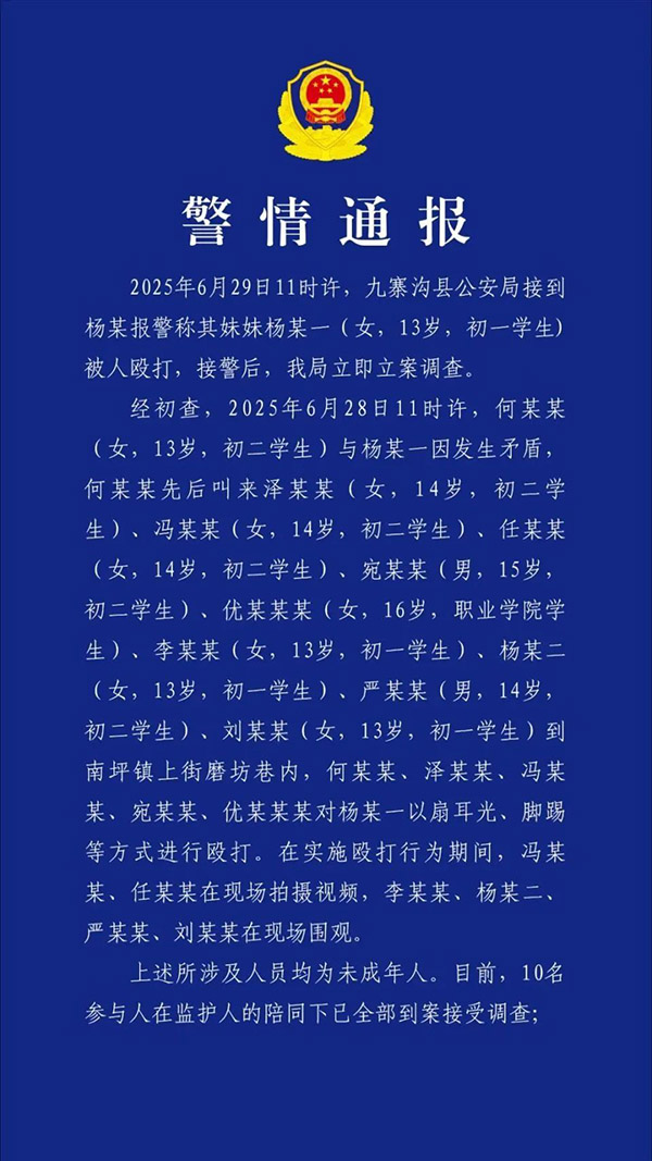 微信公眾號“平安九寨”消息,7月3日,四川省九寨溝縣公安局發佈警情通報稱,2025年6月29日11時許,九寨溝縣公安局接到楊某報警稱其妹妹楊某一(女,13歲,初一學生)被人毆打,接警後,我局立即立案調查。