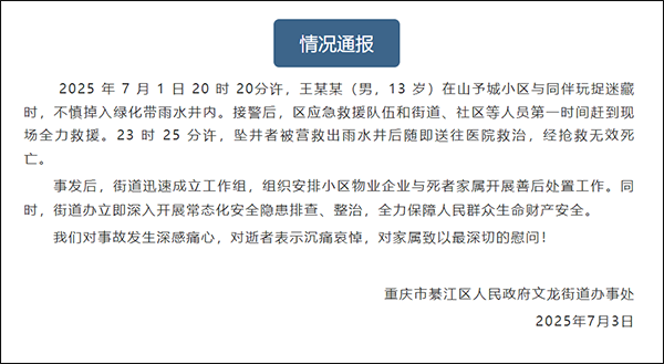 微信公眾號“文龍畫情”7月3日消息,重慶市綦江區人民政府文龍街道辦事處發佈情況通報稱,7月1日20時20分許,王某某(男,13歲)在山予城小區與同伴玩捉迷藏時,不慎掉入綠化帶雨水井內。接警後,區應急救援隊伍和街道、社區等人員第一時間趕到現場全力救援。23時25分許,墜井者被營救出雨水井後隨即送往醫院救治,經搶救無效死亡。